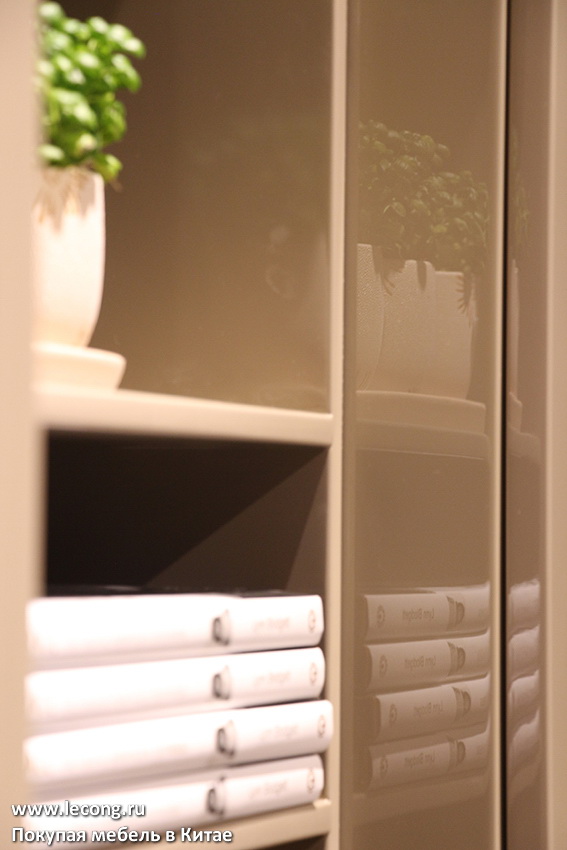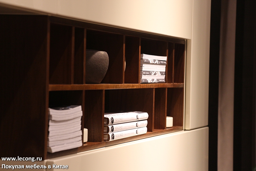 По мере того как выкладываю эти снимки, не могу отделаться от ощущения, что новая коллекция MODESIGN стала более итальянской мебелью, чем китайской. Азиатское происхождение выдают пожалуй только обеденные группы. На этом фоне забавляет то, как в этой мебели процитированы художественные решения итальянских дизайнеров начала 2000-х годов, что собственно и делает ее итальянской по духу. Про упомянутое сочетание глянцевого сплошного цвета с текстурами натурального дерева я уже говорил, а вот про полки — нет. «Фишка» большинства современных стилей — это асимметричное членение секций навесных шкафов, а также хаотичное деление полок на ниши. Смотрится, конечно, эффектно, правда я порой ломаю голову над тем, что в эти «закутки» можно было бы пристроить? Ну разве что сувенирку из различных поездок.