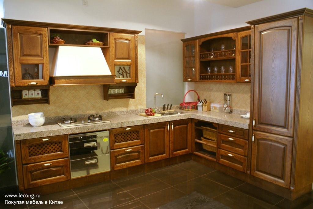 С натуральным деревом, которое так любимо в России, тоже связано несколько важных преимуществ. Обычно, когда в России предлагают фасад из натурального дерева, породу древесины не уточняют. В Китае покупатель может выбирать породы древесины, например: американский дуб, вишня, кипарис, зингана, каучуковое дерево, акация. Еще в Китае делаются резные фасады, что в России крайняя редкость. Поэтому без проблем можно заказать кухню с резным декором в классическом римском стиле.